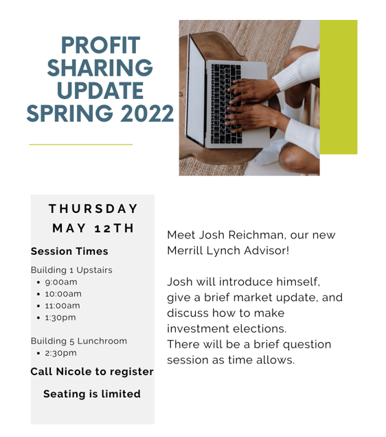 Josh Reichman, our new Merrill Lynch Advisor, will be here Thursday, May 12th to introduce himself and provide a market update. Meetings will be at 9, 10, 11 and 1:30 in B1 and at 2:30 in B5. Please call Nicole to sign up.