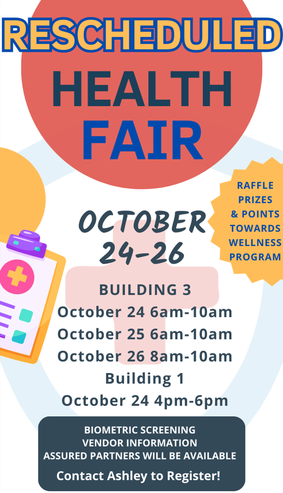 Unfortunately, due to supply chain issues at Mercy, we will be rescheduling the biometric screenings and wellness fair. The new dates are October 24th – 26th. If you are already registered for the screenings this week, we will transfer the same day of the week and time to the rescheduled date. If you need to change your appointment or get registered for the new dates, please reach out to me or Ashley. I apologize for any inconvenience this may have caused. Thank you!