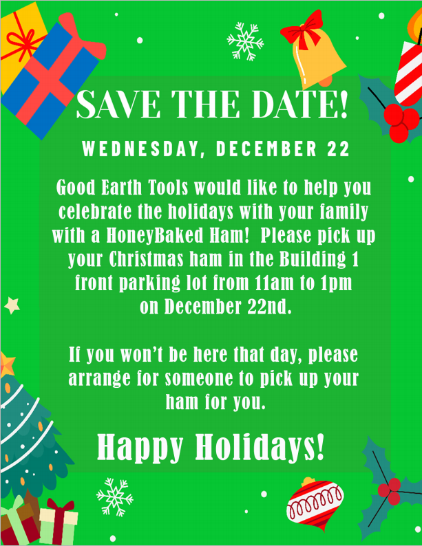 To help celebrate the holiday season, on Wednesday, December 22nd Good Earth Tools will be handing out a fresh Honey Baked Ham to each employee!